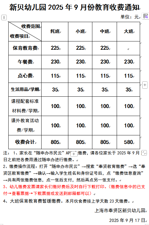 2025学年度第一学期9月份教育收费通知